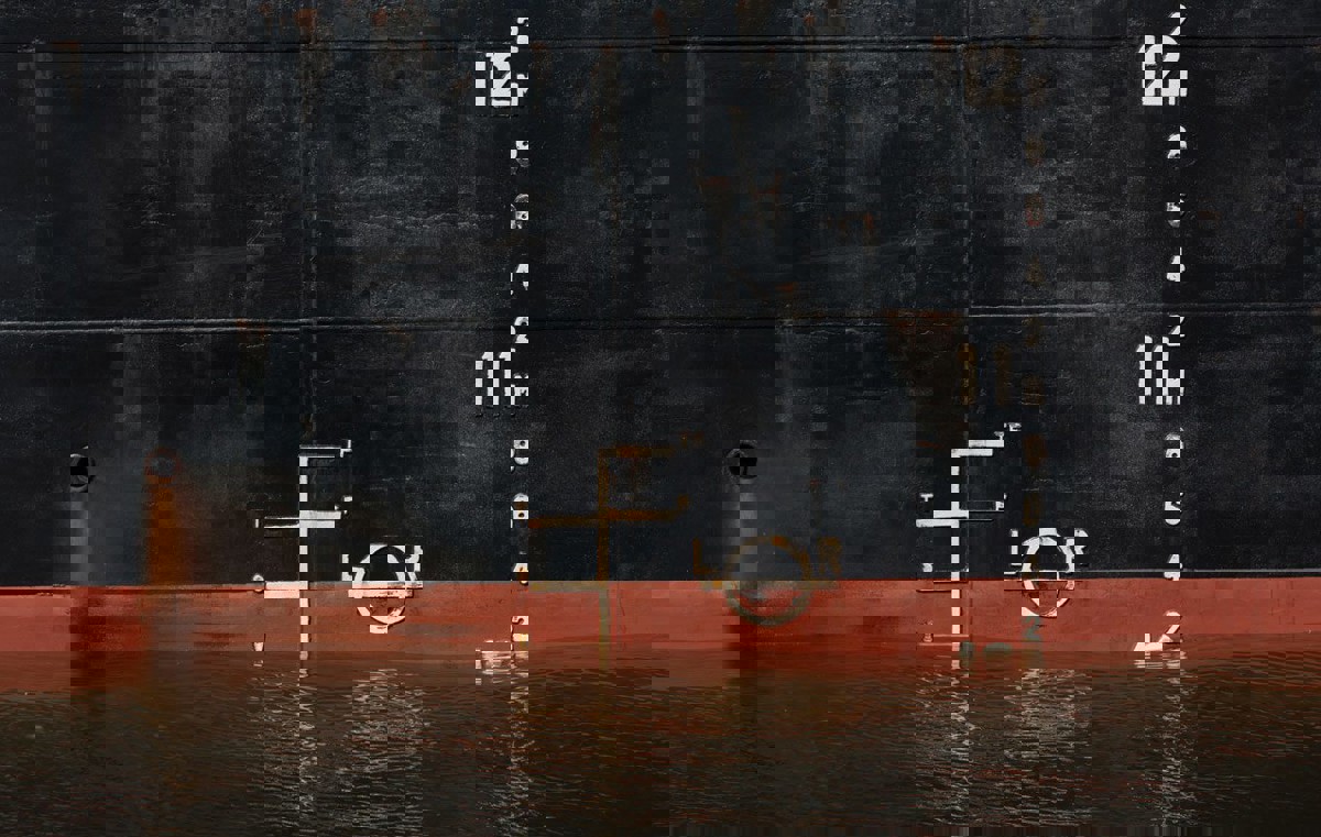 Midship draft markings on a bulk carrier. Note the problematic water level dip at the 10.20 meter draft mark which is caused by wave swell at the berth.