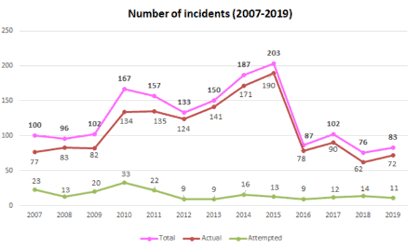 The aforementioned media reports were based on ReCAAP’s Situation Update 2019 which is an annual publication. A ReCAAP press release was also issued at the same time. The ReCAAP information sources advised that a total of 83 piracy/armed robbery incidents (72 actual incidents and 11 unsuccessful incidents) had occurred in Asian Waters in 2019. The total of 83 incidents in 2019 was 7 more than in 2018 (a 9% increase). To put this comparative data into context, it was also the 2nd lowest total incident number (which occurred in 2018) since ReCAAP records began in 2007. This information is illustrated by a graph extracted from a ReCAAP PowerPoint as below: