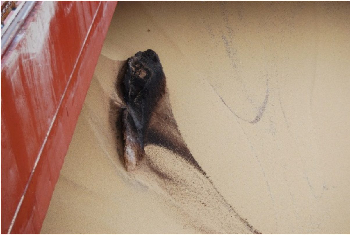The ingress of seawater through steel cargo hatch covers and wet damage to cargo presents a high-cost risk for shipowners and their P&I insurers. The black column of wet grain in the above photo illustrates this.