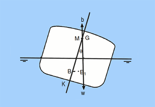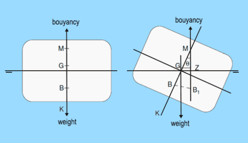 A vessel’s ability to stay upright and return to the upright, if heeled over by an external force, is based on the positional relationship between two points of force being Gravity (G) downwards and Buoyancy (B) upwards and one point of balance, the Metacentre (M), which are all shown in the diagrams below.
